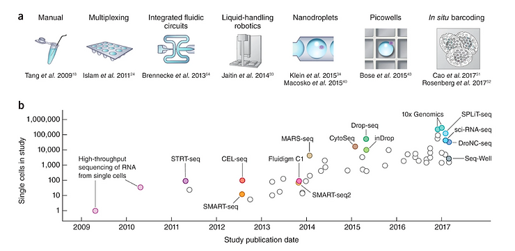 Scaling of sc-RNAseq experiments from 2009 to 2017. Image credits to Svensson et.al